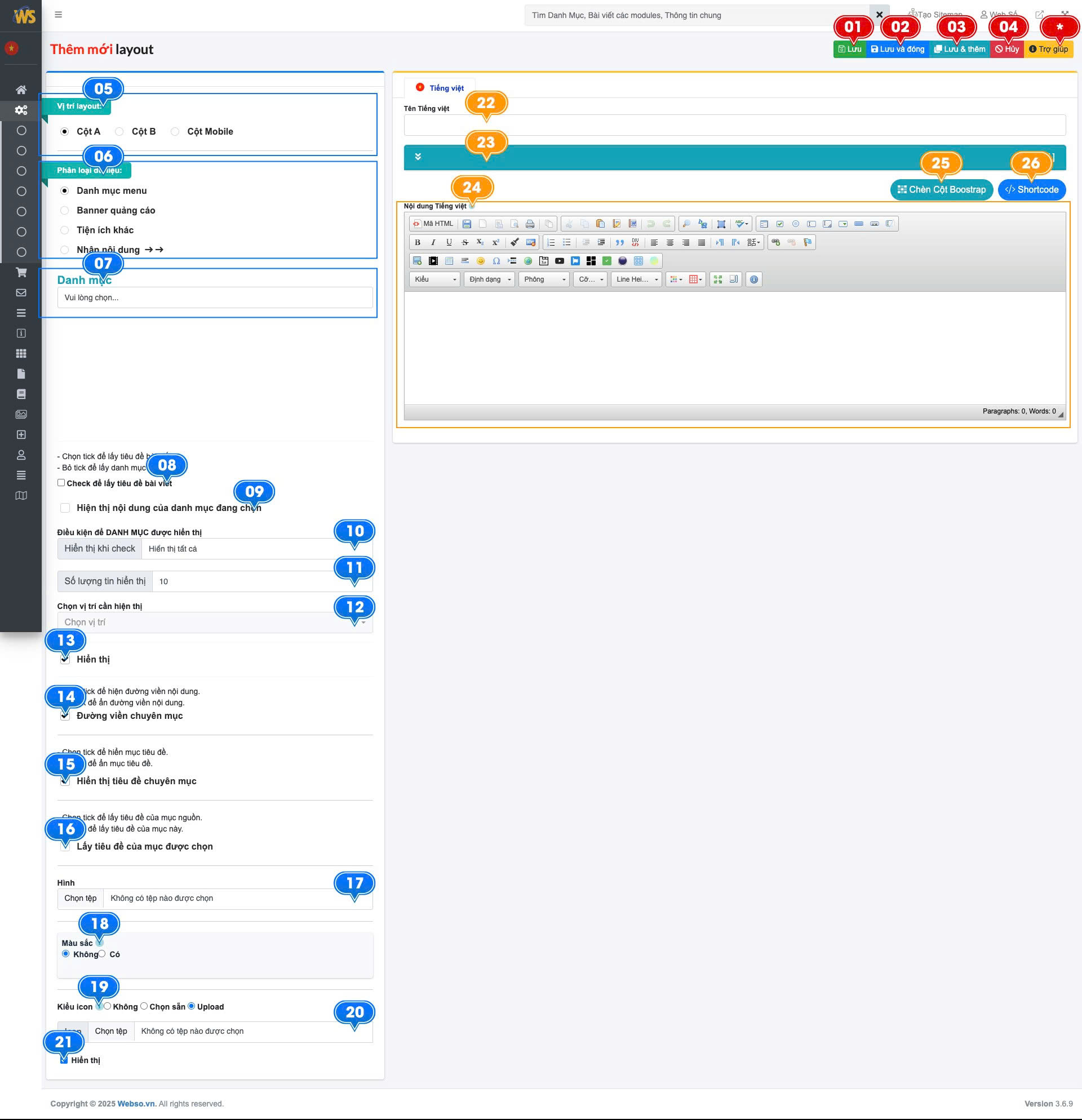 Video hướng dẫn thêm cấu hình layout để thiết lập bố cục hiển thị riêng cho các cột trang destop hoặc danh mục trên mobi, giúp website trình bày nội dung trực quan và chuyên nghiệp hơn.