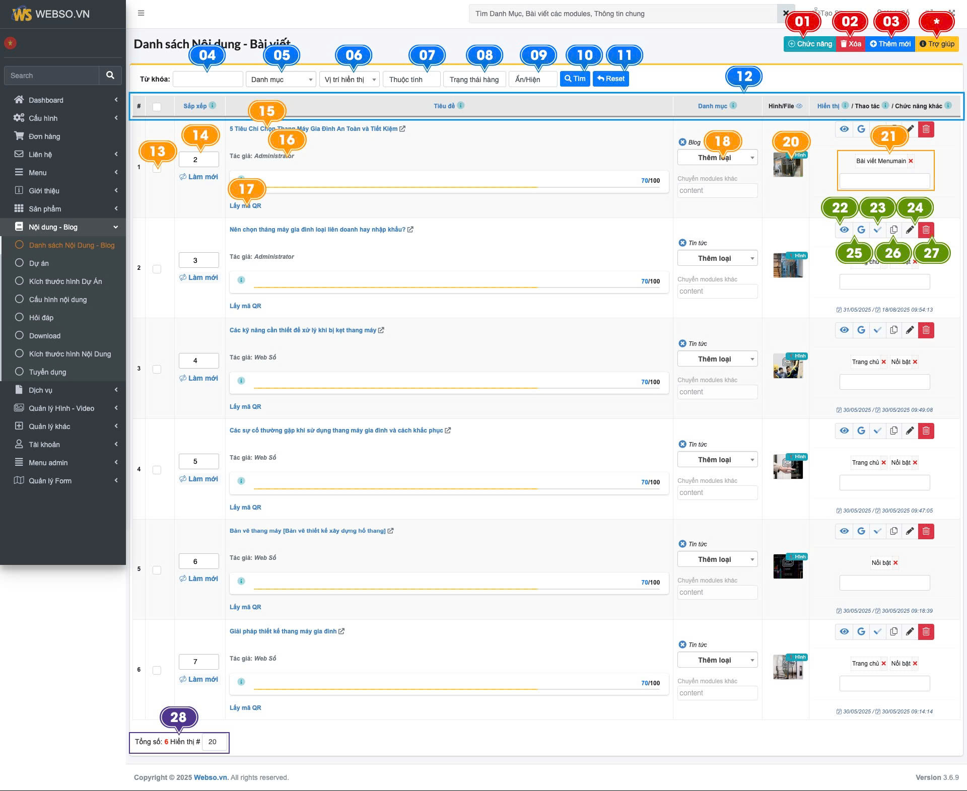 Sau khi đăng nhập trang quản trị, đi tới: Blog - Tin Tức > Danh sách bài viết. Dưới đây là các thành phần và chức năng trên trang danh sách.