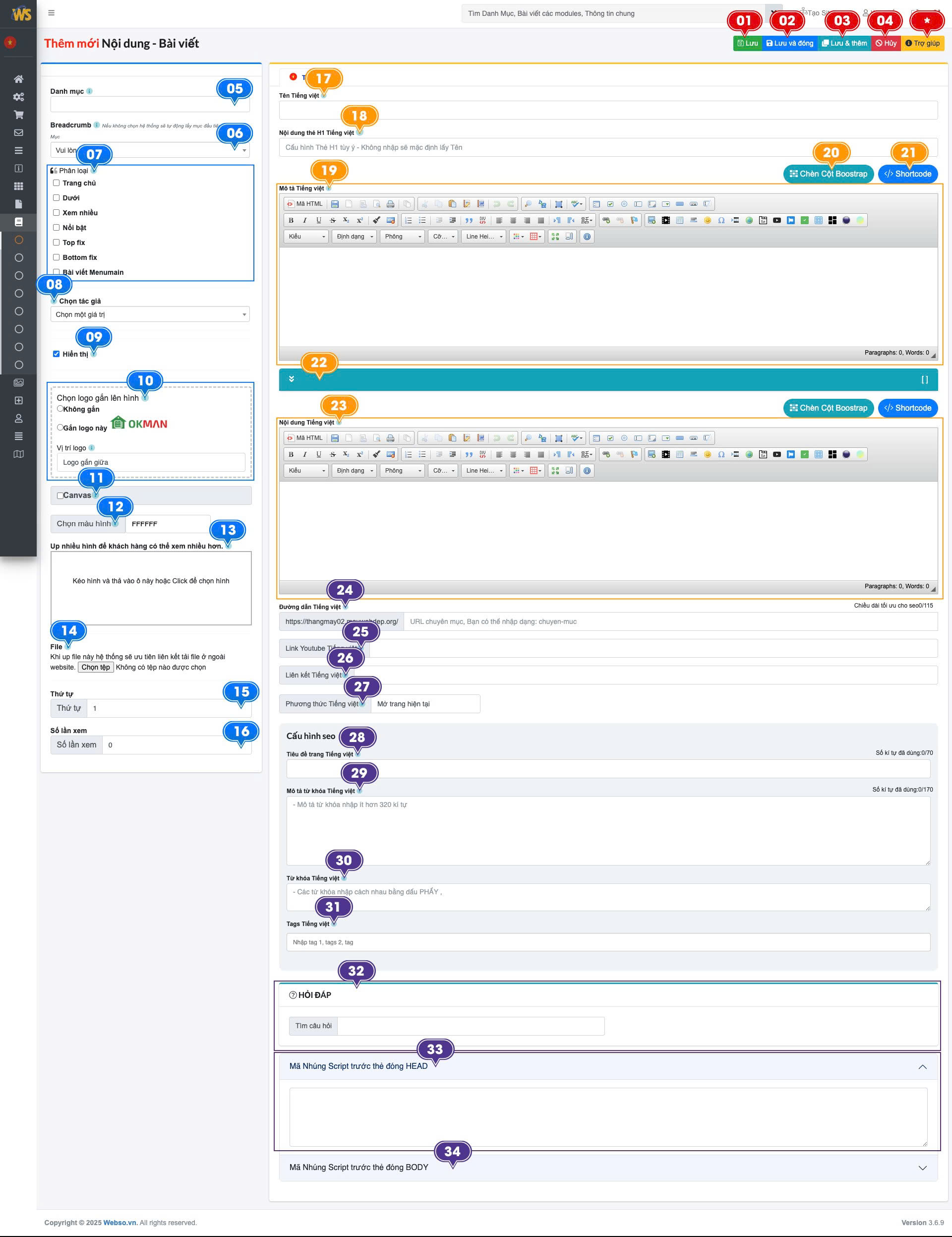 Vào: Blog - Tin Tức > Thêm mới. Màn hình tạo bài viết gồm các khu vực sau.