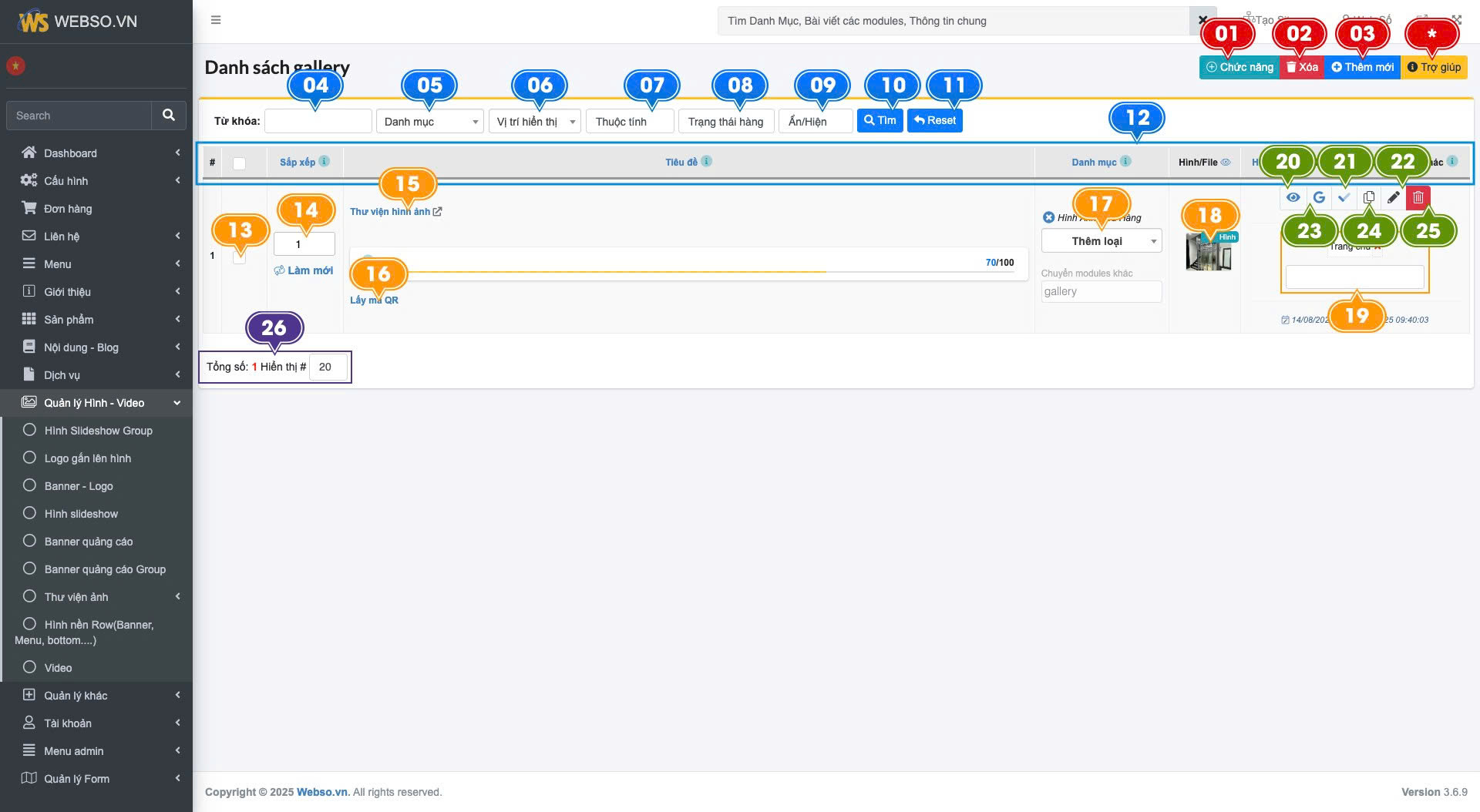 Sau khi đăng nhập vào trang quản trị , chúng ta sẽ đến với phần Quản lý hình - video > Thư viện ảnh > Danh sách thư viện ảnh. Đây là các tính năng trong trang danh sách sản phẩm