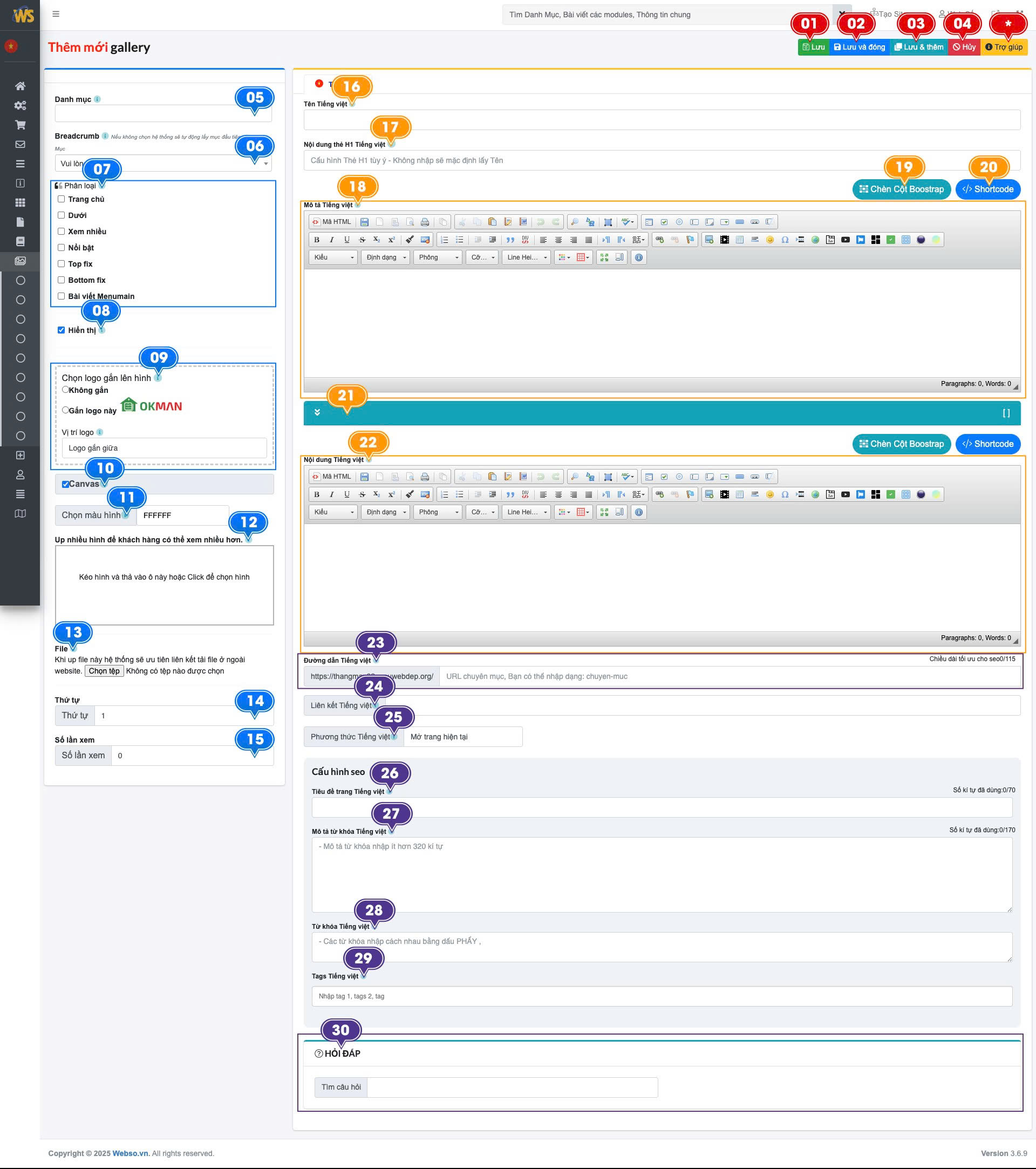 Sau khi vào trang Danh sách thư viện ảnh , tiếp đến sẽ chọn vào ô < thêm mới > ở góc phải màn hình phía ảnh trên có số ký tự ( 03 ) để mở ra trang From để nhập các thông tin, đầu tiên chúng sẽ cùng tìm hiểu các tính năng ở phân mục này